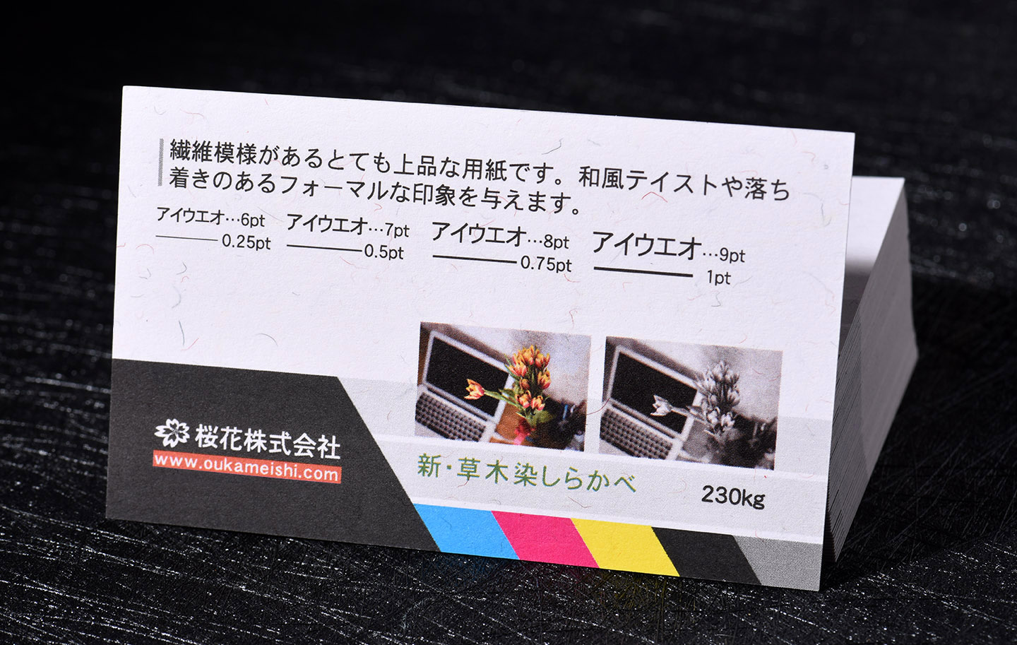 新・草木染しらかべ(230kg) 繊維模様があるとても上品な用紙です。和風テイストや落ち着きのあるフォーマルな印象を与えます。 |